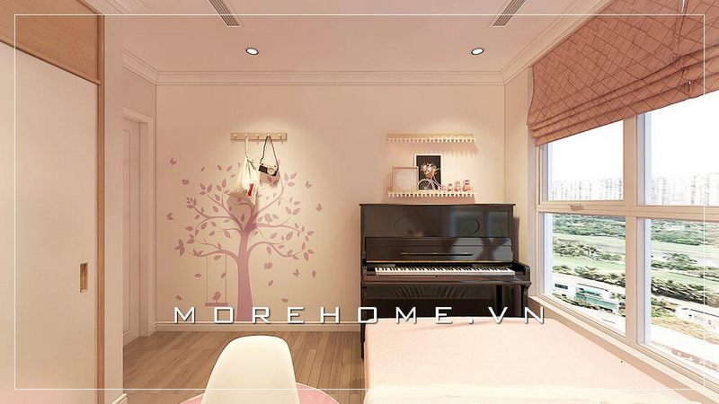 Không gian phòng ngủ của bé được trang trí bằng một chiếc piano đẹp, hiện đại và độc đáo.