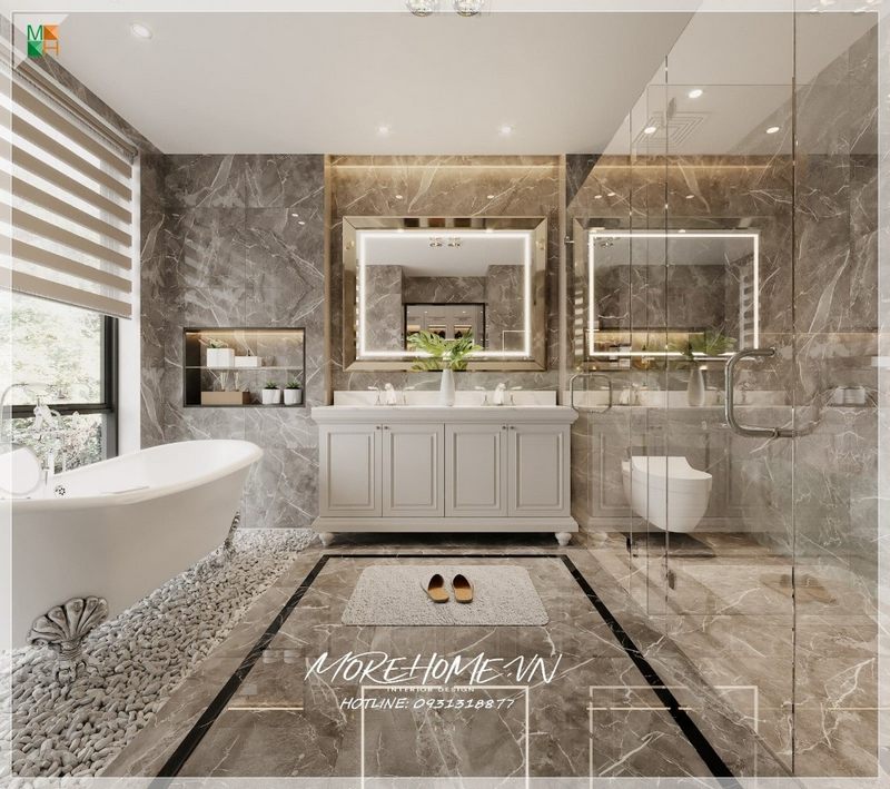 Mẫu thiết kế phòng tắm master được trang bị bồn tắm siêu sang chảnh, đá ốp nhân tạo xám vân mây và các thiết bị vệ sinh cao cấp, đảm bảo không gian thư giãn tối ưu cho gia chủ.