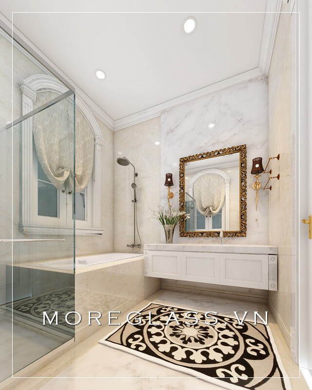 Mẫu thiết kế nội thất phòng tắm cao cấp được trang trí bằng đá ốp tường màu trắng vân mây mang đến sự sang trọng và đẳng cấp, tạo nên điểm nhấn nổi bật cho căn phòng.
